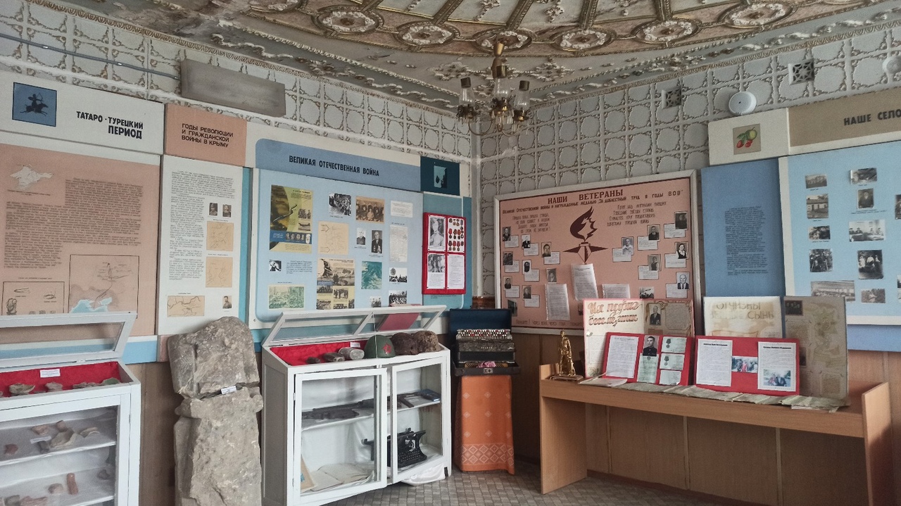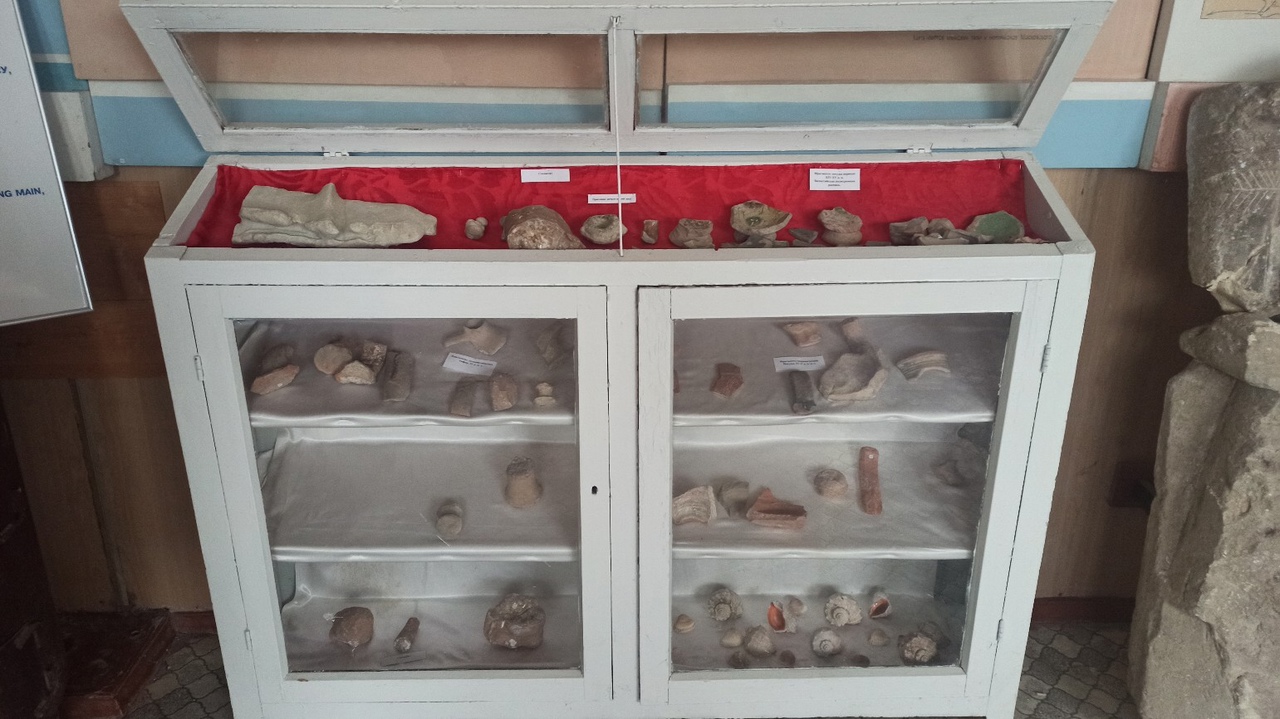Основной фонд музея насчитывает 157 музейных экспонатов. В его состав входят:а) вещественные памятники: фрагменты гончарных изделий разного исторического периода, предметы быта ( посуда, баян, утюги др.), фрагменты-макеты оружия, нумизматические материалы, награды, одежда, образцы горных пород (сталактиты), археологические находки (окаменелости);
